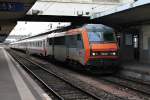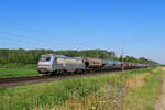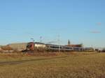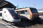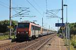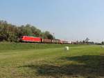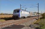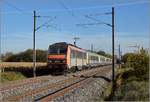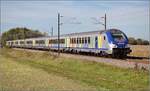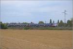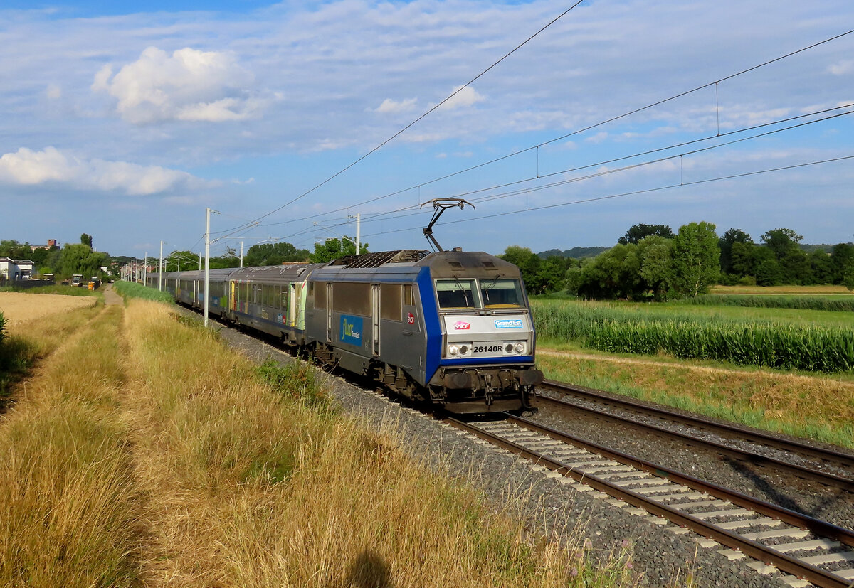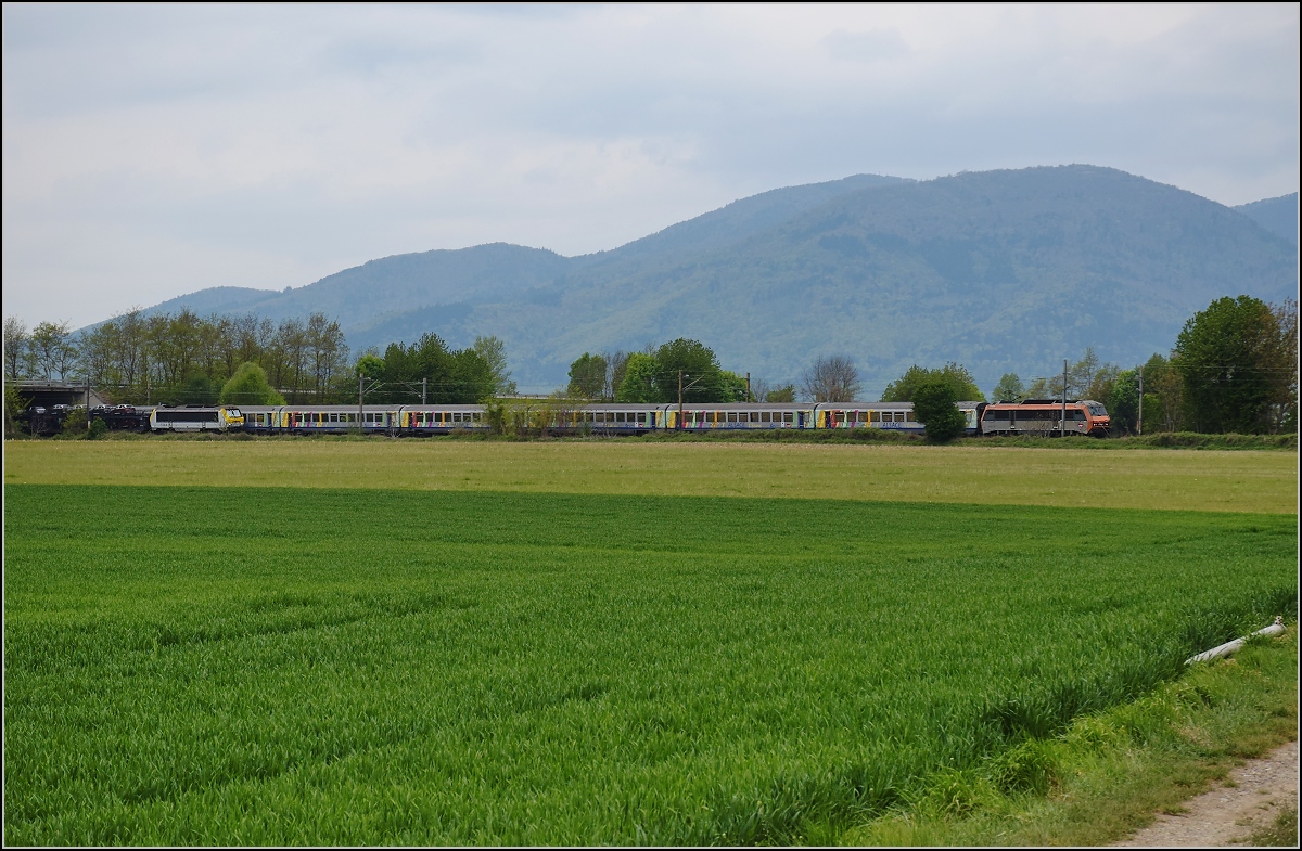 Bei so viel Geschichte kann die Bahn hinter den kleinen Erdwällen ein wenig in den Hintergrund treten. Bei Raedersheim begegnen sich Sybic 26151 mit ihrem TER Richtung Mülhausen und die belgische Astride 1344 mit einem Autozug gen Norden. Das Bild entstand bereits im April 2017.