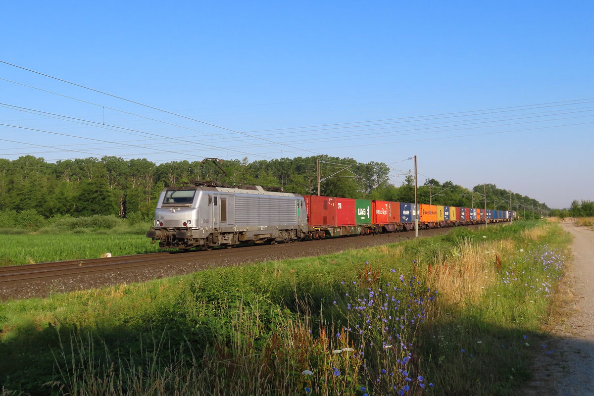 Montag den 29.09.2025 um 12:14 Uhr in Bellegarde-sur-Valserine (F) im Département Ain. Im alten Bahnhofteil des Bahnhofs Bellegarde fährt soeben ein Güterzug durch. Er besteht aus folgenden Triebfahrzeugen; 1. Lok: 91 87 0037 515-0 F-AKIEM (Interne Bezeichnung: akiem PRIMA E37515), 2. Lok: 91 87 0037 519-2 F-AKIEM (Interne Bezeichnung: akiem PRIMA E37519). Diese Lokomotiven sind für drei Stromsysteme zugelassen: 1,5 kV =, 25 kV 50 Hz, 15 kV 16.7 Hz. Es sind Alstom Prima EL3U/4 Lokomotiven. Beide Baujahr 2008. Ladung der Wagen nach Angaben der Wagenetiketten: Paletten mit 1 Liter Mehrwegflaschen. Bestimmungsbahnhof ist Gare de Publier bei Èvian–les–Bains am Genfersee. In Publier befindet sich auch die Abfüllanlage des Mineralwassers Èvian. Koordinaten GMS (Grad, Minuten, Sekunden): N 46° 6’ 37.2’’ O 5° 49’ 27.4’’