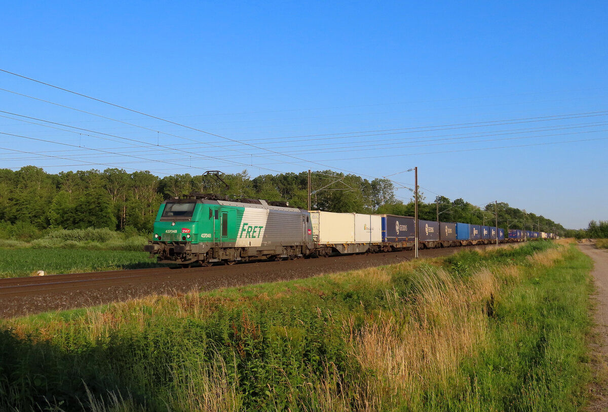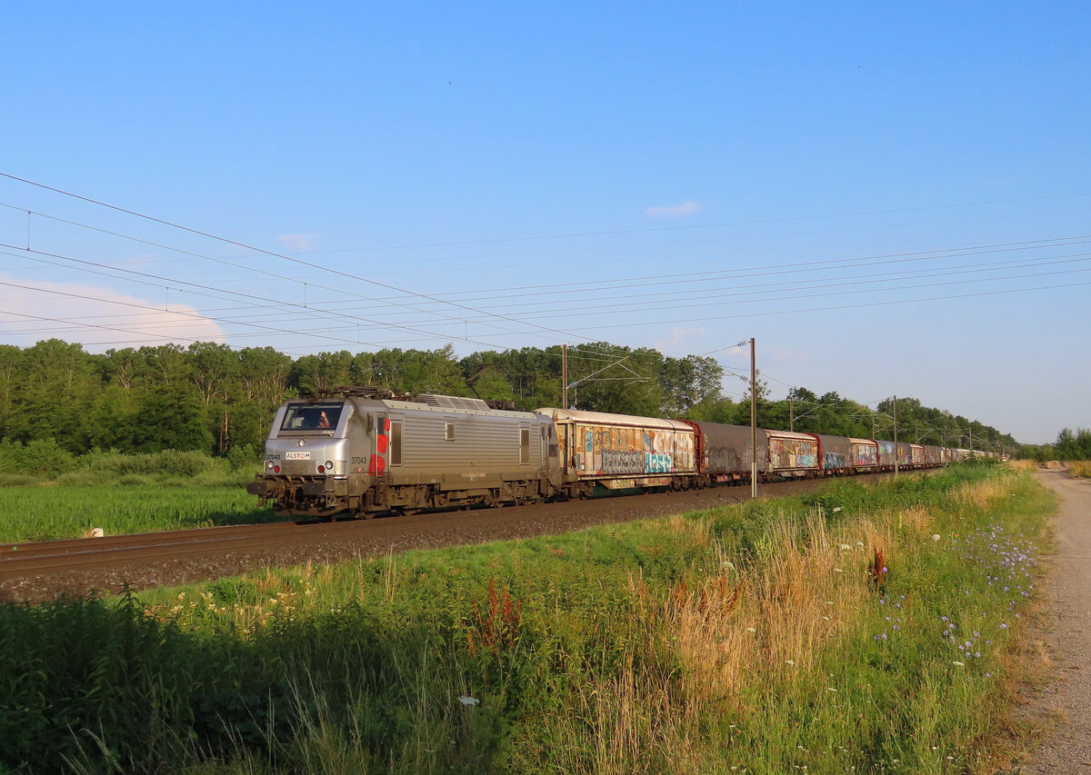 Schwindratzheim - 19. September 2025 : Akiem/CFL Cargo BB 37012 mit dem 44572 von Basel nach Hagondange. Dieser Zug kann ein Kombi sowie ein Gemichter sein. Aber am Diesem Tag waren drei IC Steuerwagen am Zug. Diese sind verkauft, kamen aus Polen und sind nach Tergnier unterwegs wo sie renoviert werden.
