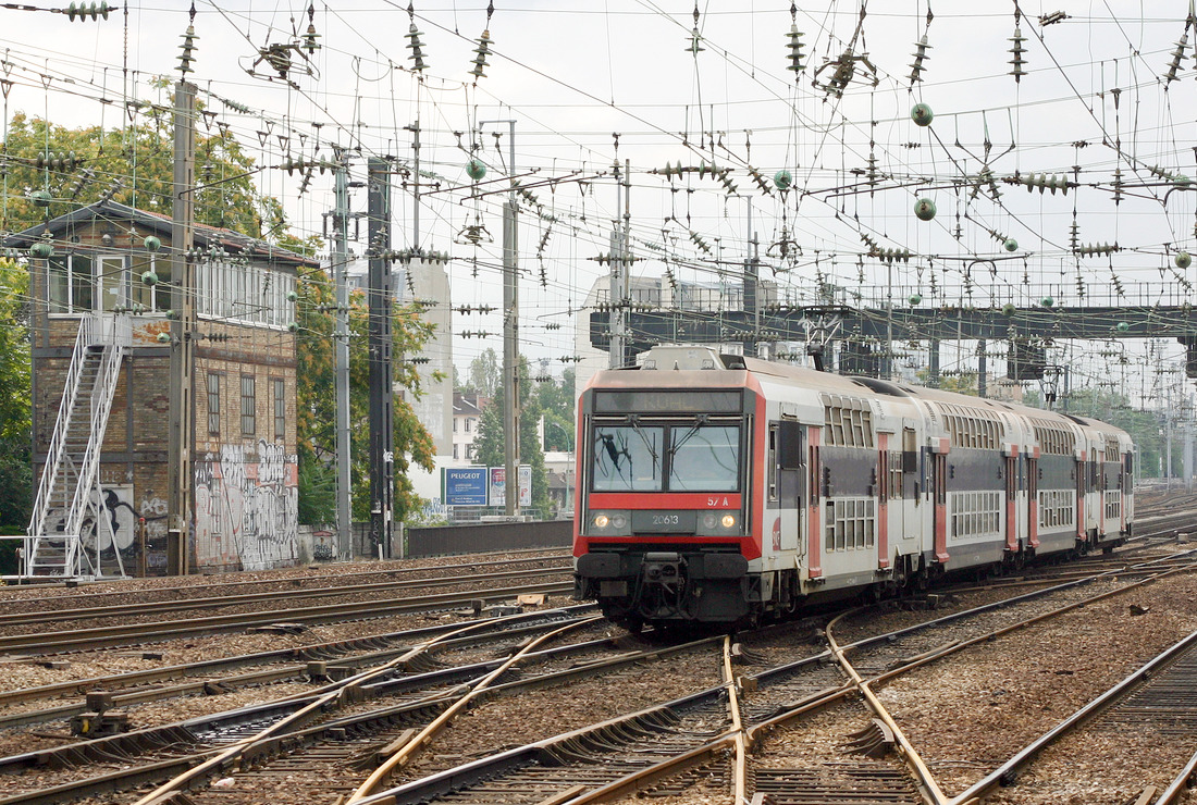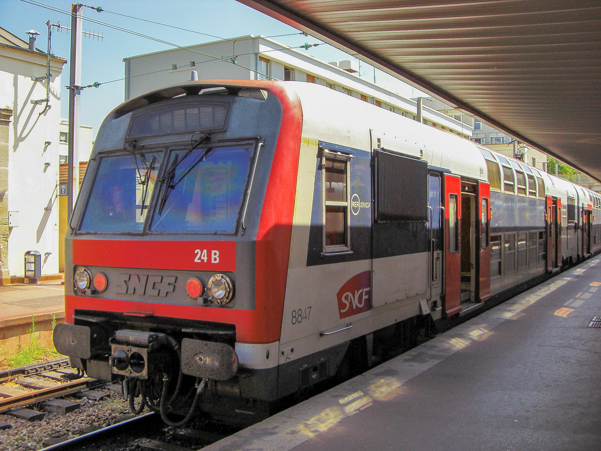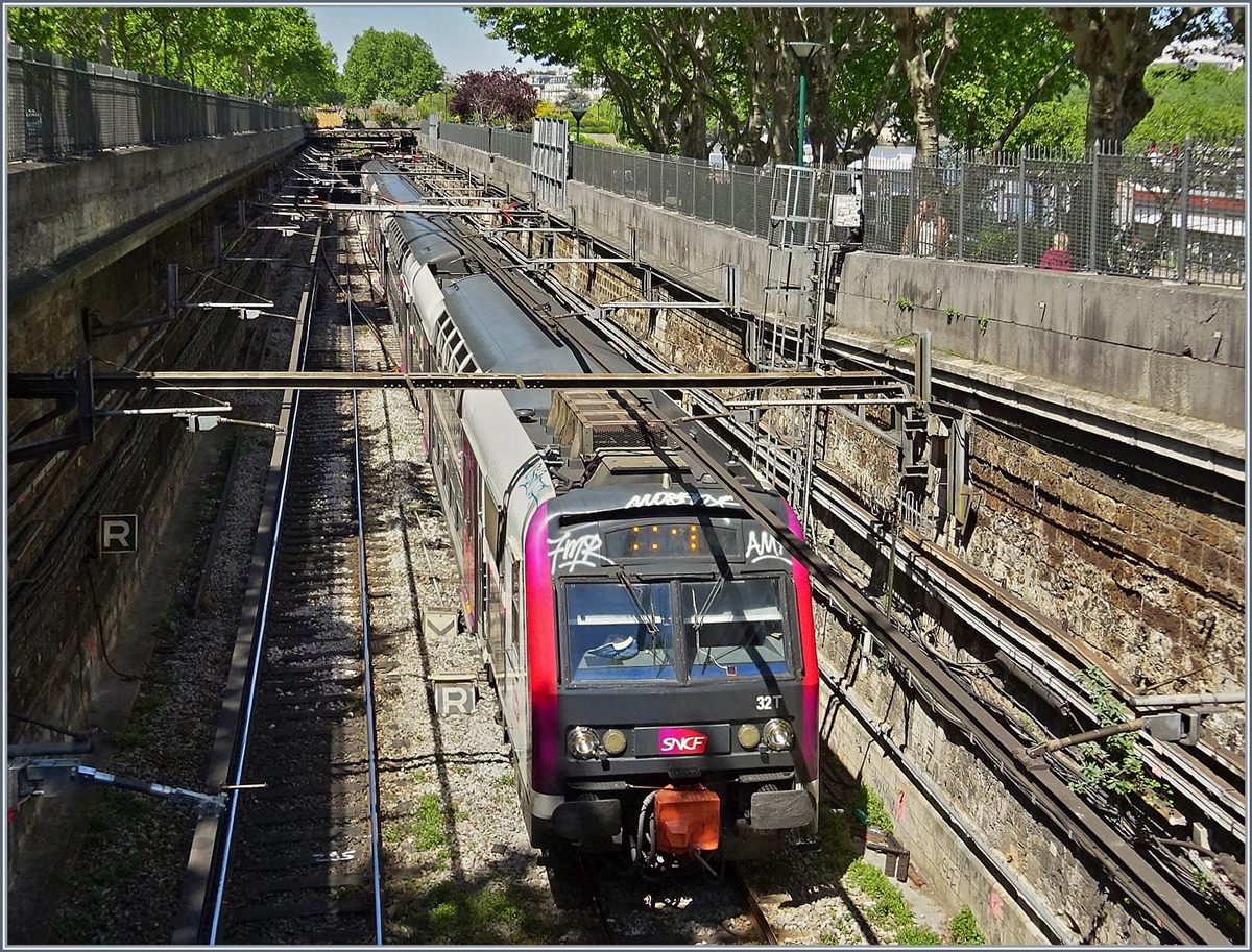 SNCF-Triebzug Z8883 unterwegs auf der RER Linie C mit Eiffelturm im Hintergrund.