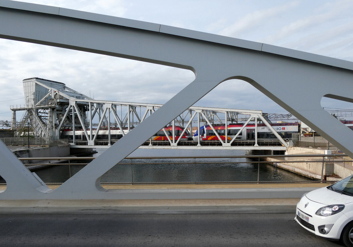 Hier stehen zwei Triebwagen des Types TER AGC im Bahnhof Trouville-Deauville im Sommer 2017 in der Normandie, sie besitzen eine gemütliche Innenausstattung mit weichen Sitzen und haben in allen Komfortklassen Trennwände die für eine ruhige Atmosphäre beihelfen außerdem gibt es "Sofas", Leselampen, und Klapptische in Sitzgruppen. Viele dieser Züge können sowohl mit Strom als auch mit Dieselantrieb fahren.