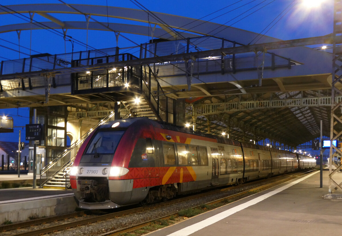 In La Roche-sur-Foron wartet der SBB LEX RABe 522 als SL2 von Annecy nach Coppet und der SNCF Z27534 als TER nach Annecy auf die baldige Abfahrt. Die TER von St-Gervais-les-Bains Le-Fayette nach Annecy verkehren im Gegensatz zum stündlichen Léman Express SL2 / rep. RL2 nur in der Hauptverkehrszeit und entsprechender Lastrichtung.