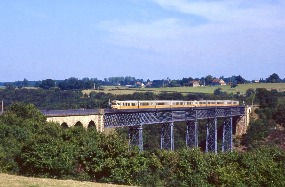 Der fünfteilige Gasturbinentriebwagen der SNCF TBD 2038, angetrieben von zwei Gasturbinen in den beiden Triebköpfen, 1995 im Bf. Lyon-Perrache.