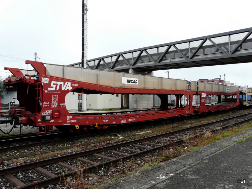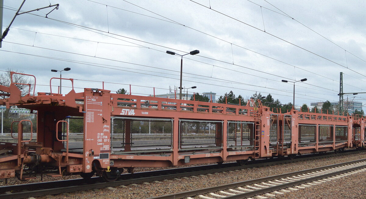 Gelenkwagen für den Kfz-Transport vom französischen Einsteller STVA mit der Nr. 23 RIV 87 F-STVA 4363 137-2 Laaers in einem Ganzzug (leer) am 09.02.22 Bf. Flughafen BER - Terminal 5. Lothar Stöckmann
