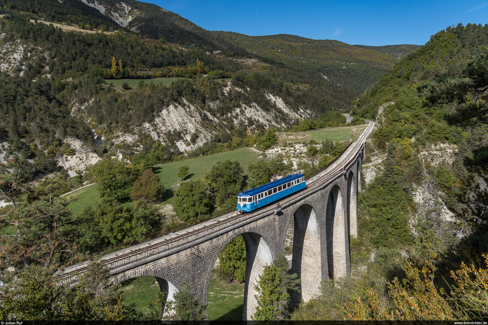Ein Autorail kreuzt in Annot einen Arbeitszug mit der Diesellok 62.