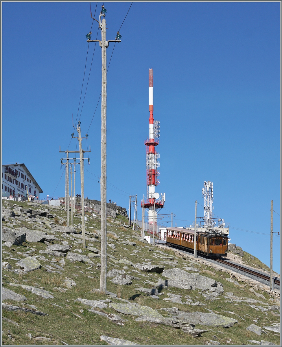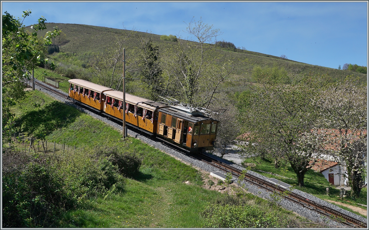 Nein, ich habe nicht das falsche Bild hochgeladen, denn wer genau hinschaut sieht die Ausweichstation der Chemin der Fer de la Rhune und dort, bzw. kurz davor insgesamt drei Chemin de Fer de la Rhune Züge. Das Bild entstand unweit des Gipfels des La Rhune, und dort sind auch etliche dieser Pferdchen heimisch.
