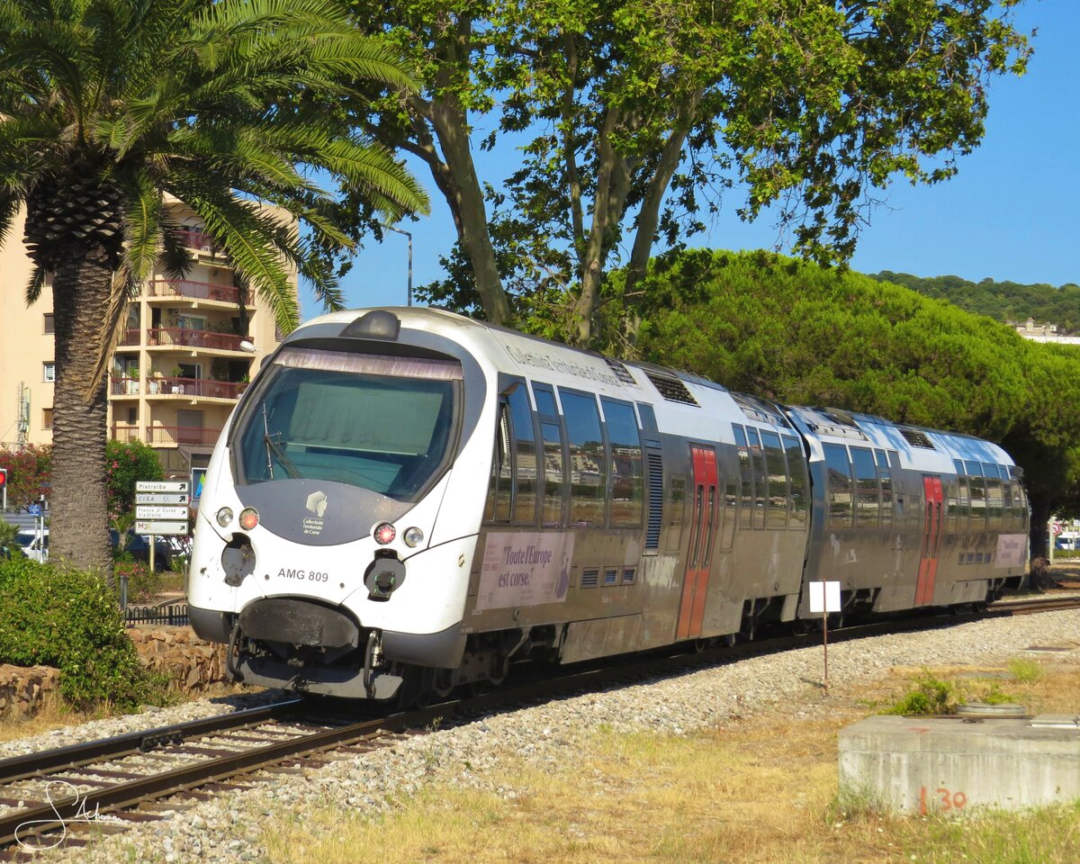 Obwohl der Dampfbetrieb bei den korsischen Eisenbahnen bereits 1954 endete, findet man auf einigen Stationen immer Wasserkräne wie diesen hier in Ajaccio, den AMG 803 am 12.06.2014 passiert