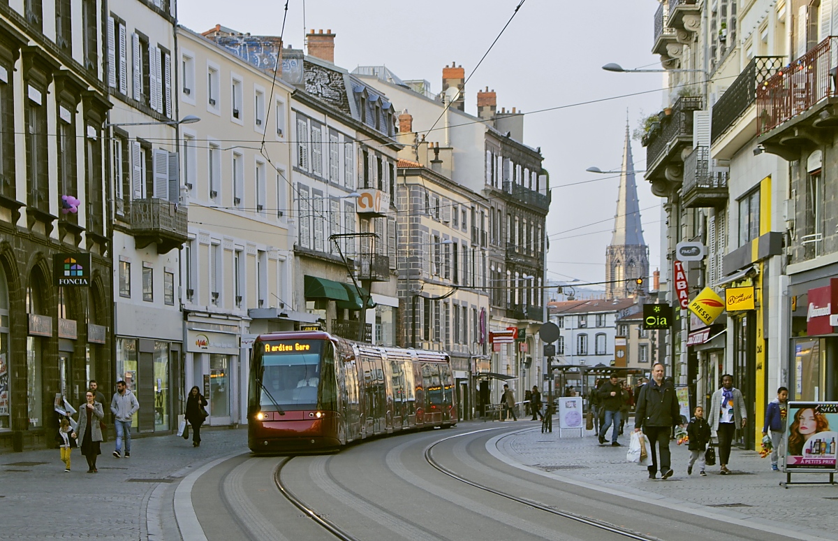 Ein Translohrtriebwagen fährt den Viaduc Saint Jacques hinauf in Richtung Les Vergnes.