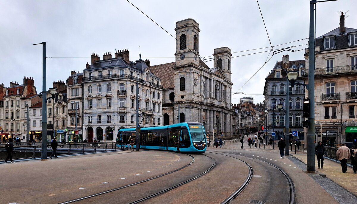 Die Straßenbahn Saint-Étienne fährt auf einem Meterspurnetz, hier ein 33m langer Urbos vom spanischen Unternehmen CAF im August 2020 am Place Du Peuple.