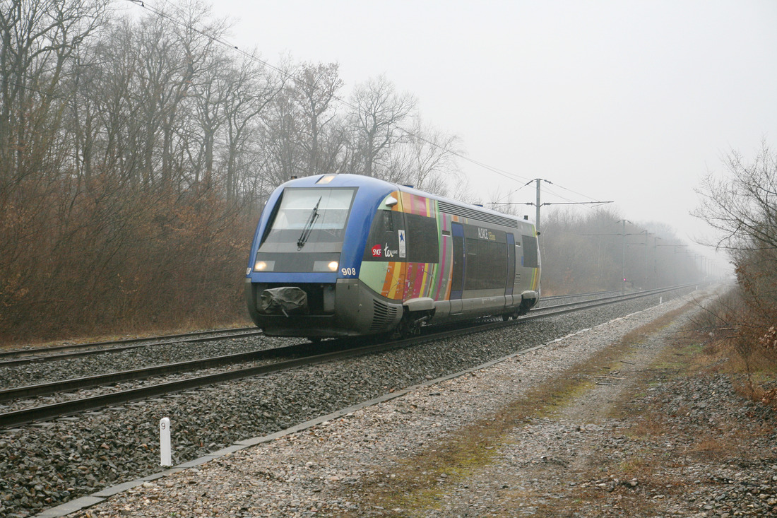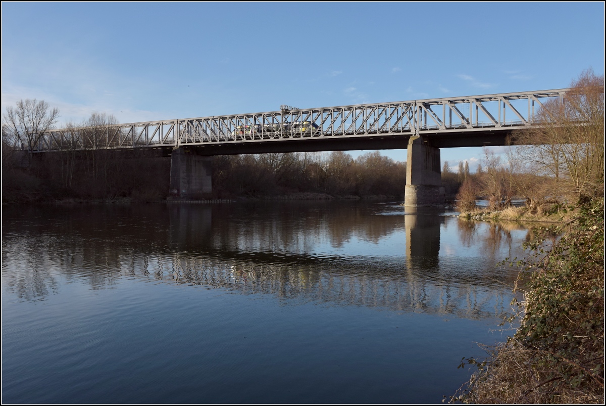 Bahn im Markgräfler Land. Das längere Stück der Verbindungbahn Müllheim - Mühlhausen liegt im Elsass. Hier noch die zweite "Rheinbrücke" über den Rheinseitenkanal, der bereits vollständig im Elsass liegt. Im Hintergrund ist der Kaiserstuhl sichtbar, wo man noch von einer Wiederherstellung des Bahnverkehrs Freiburg - Colmar träumt. Hier weiter südlich ist es bereits Realität, auch dank mittlerweile heute über Kehl geführten TGV-Verbindung nach Freiburg. März 2019.