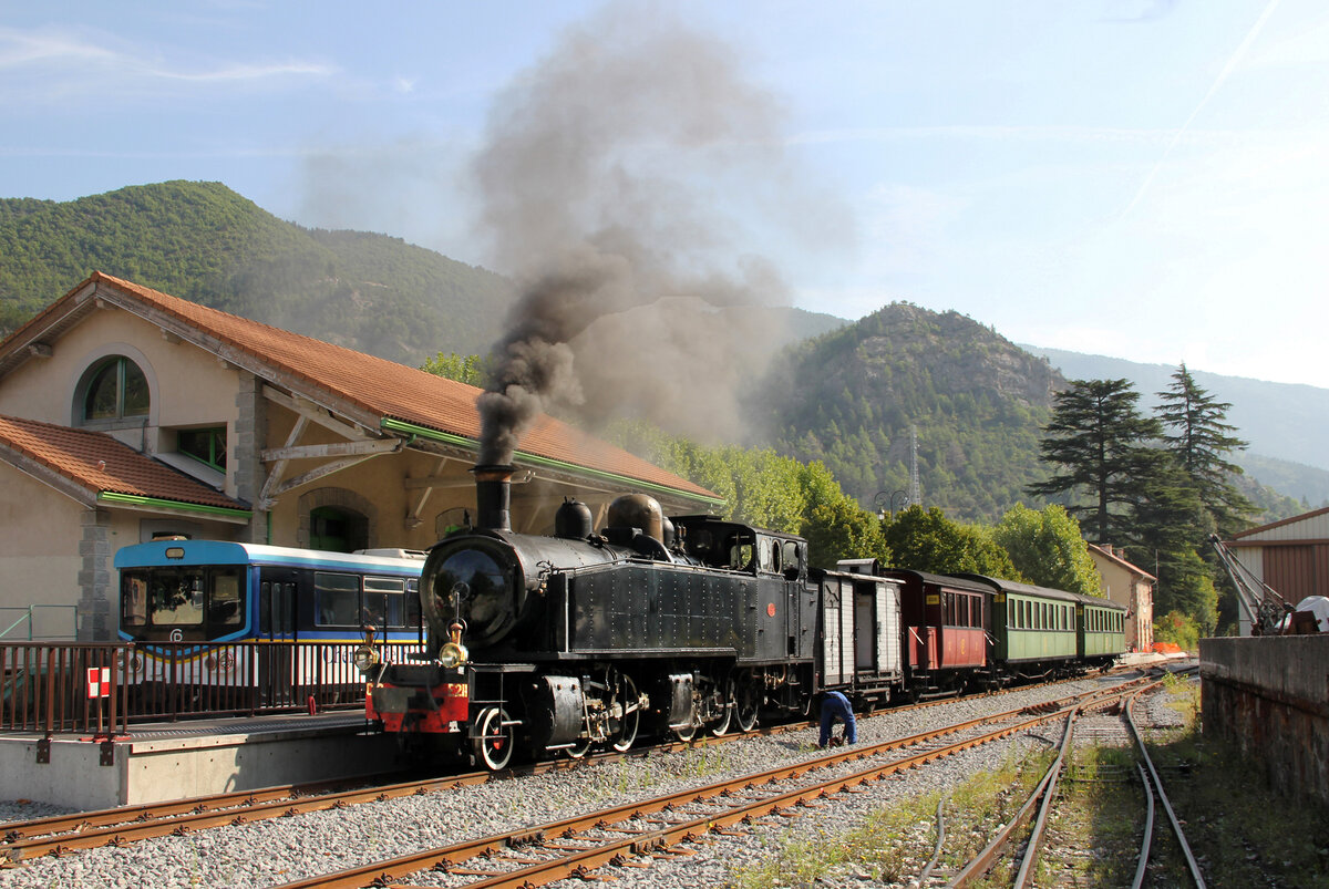 Unser Triebwagen X304 von Nizza nach Puget-Théniers wartet in Villars-sur-Var auf den Gegenzug. Villars-sur-Var, 30.08.2019