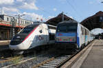Der TGV LYRIA 9203 von Paris Gare de Lyon nach Zürich bestehend aus dem Triebzug 4726, bietet dem im Bahnhof von Meroux wartenden SNCF Z73800 Coradia A TER  Baleine  nach Belfort einen recht knappen Anschluss.