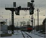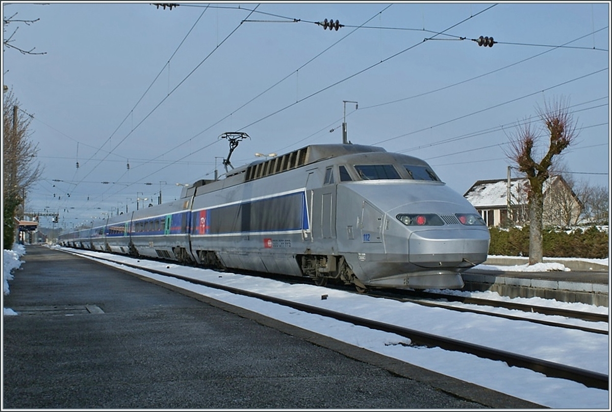 Der TGV "Ligne de Coeur" (Rame 112) ist von Lausanne nach Paris Gare de Lyon unterwegs und wartet nach einem kurzen Halt in Frasne auf die Weiterfahrt.