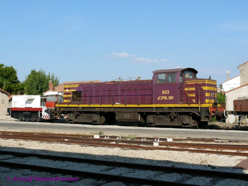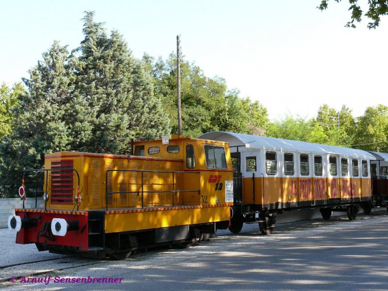 Lok51 der RDT13, ein dieselelektrischer B-Kuppler des Herstellers Fauvet-Girel. Diese Lok wird auch vor dem Touristenzug "Le-Petit-Train-des-Alpilles", der auf der RDT13-Strecke in die pittoreske Gegend der Alpilles=Älpchen fährt, eingesetzt.