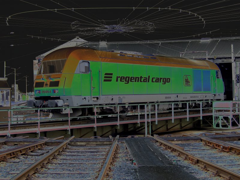 Die himmelblaue 253 015 der Regental Cargo beim Rangieren. Beim Original war der Himmel sehr überbelichtet, und per "Solarisieren" ist dieses bunte Bild herausgekommen. [18.02.07]