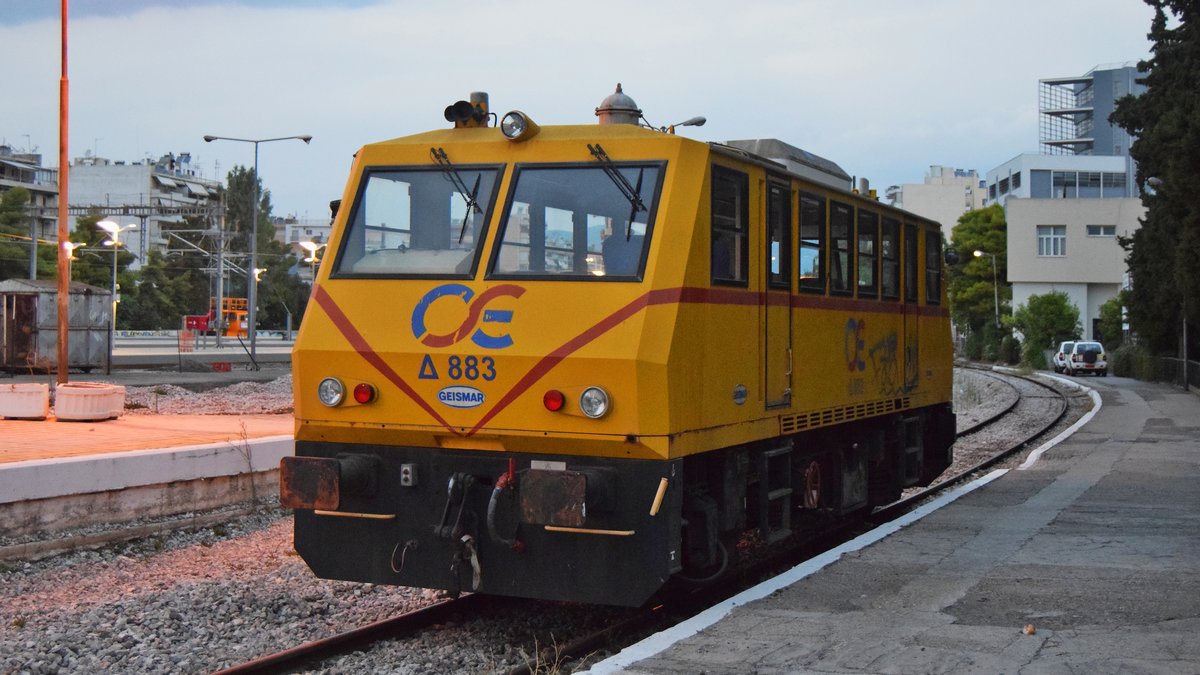 Bahndienstfahrzeug Delta 883 stand am späten Abend des 11.09.2018 abgestellt in Bahnhof Athen Larissa.