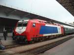 Die beiden Kurswagen nach Sofia bekommen für die Fahrt vom griechischen Bf Strimon zum bulgarischen Grenzbahnhof Kulata eine neue Lok (220 03 1).