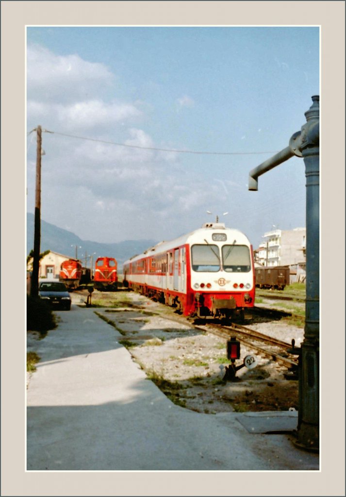 Diesel-elektrische Triebwagen der Baureihe A520 (AEG-LEW 1989) der OSE (Griechische Staatsbahn) im Bahnhof Tithorea, 22.07.2002. Diese Triebwagen haben die Achsfolge Bo-Bo in vorderen bzw. hinteren Lokomotiven. Sie haben eine Höchstgeschwindigkeit von 160Km/h und OSE rief sie IC (InterCity) an. DIMITRIS KOSTOPOULOS