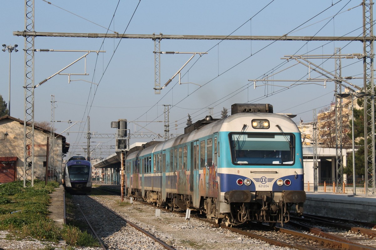 621104 der OSE/ΟΣΕ (Organismos Sidirodromon Ellados/Οργανισμός Σιδηροδρόμων Ελλάδος) mit Regionalzug Larissa/Λάρισα-Volos/Βόλος auf Bahnhof Larissa/Λάρισα am 1-3-2013. Date Jan de Vries