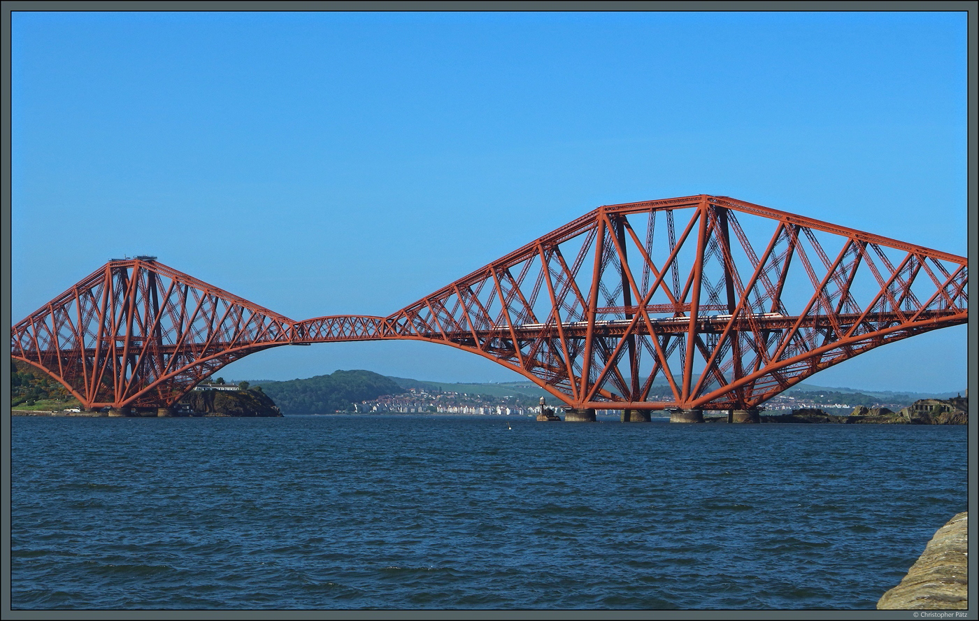 Der Azuro-Triebwagen der LNER passiert mit der Forth-Brücke bei Queensferry das wohl eindrucksvollste Bauwerk auf der Fahrt von Aberdeen nach London. Winzig wirkt der 9-teilige Triebwagen der Baureihe 800 im Vergleich zu der mächtigen, zum Unesco-Welterbe zählenden Stahlkonstruktion. (15.05.2025)