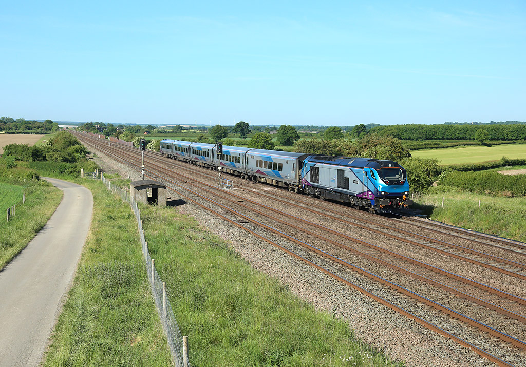 69014 & 68022 pass Baldwins Gate whilst hauling a Crewe Basford Hall - Bescot engineers train, 28 MAy 2020