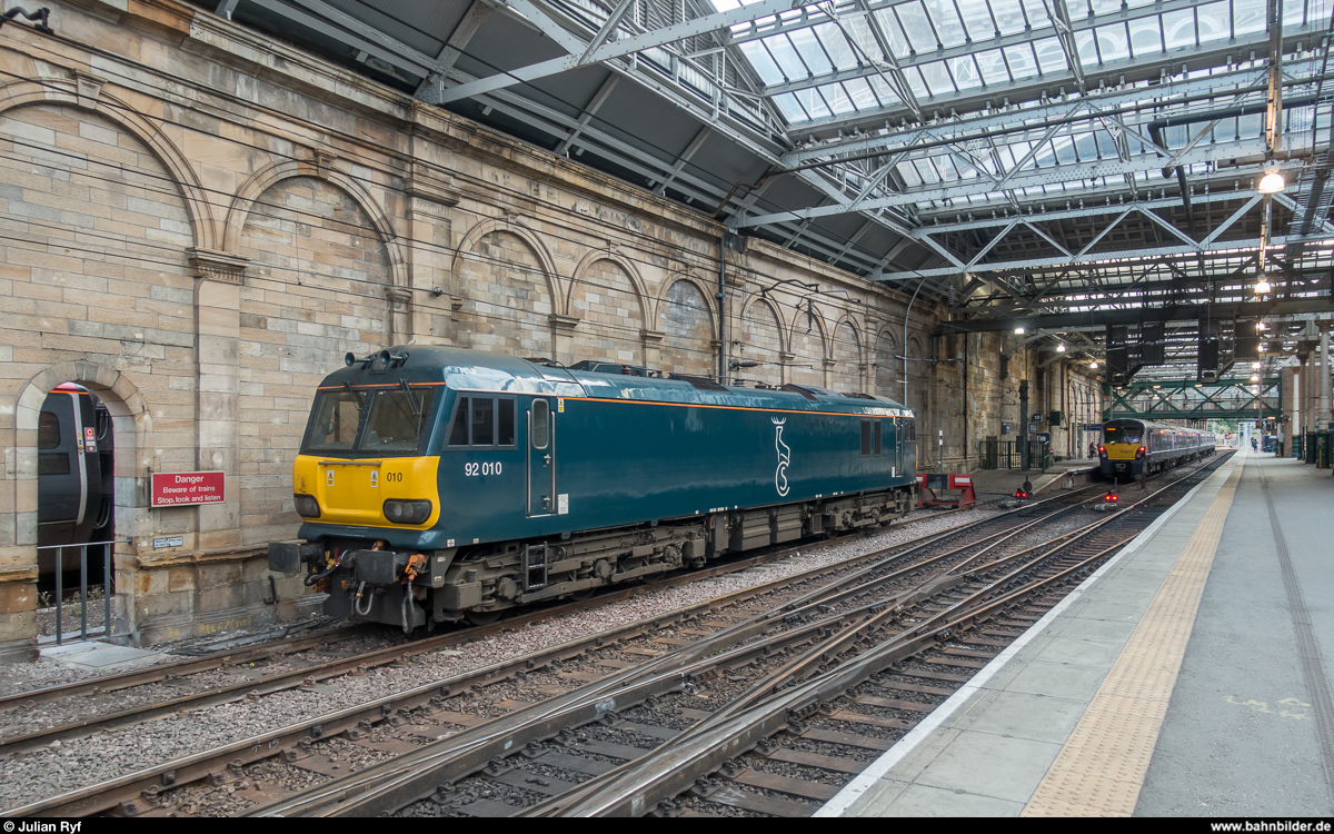 GBRf 92 010, vermietet an Caledonian Sleeper, steht am 20. August 2017 in Edinburgh Waverley abgestellt und wartet auf den Nachtzug nach London Euston. Julian Ryf
