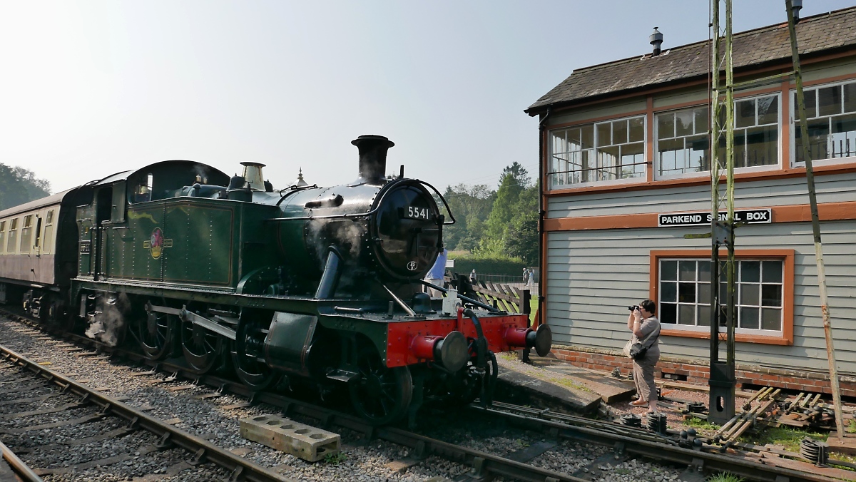 Warten auf Abfahrt: Dampflok No. 5541 der GWR 2-6-2T 4575 Class vor einem BR Mk1 Wagen der Dean Forest Railway in der Norchard High Level Station, 14.9.2016