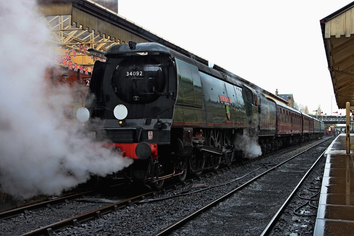 Auf die Zeit zur Abfahrt wartet, bei typisch englischen Wetter, die 34092 "CITY OF WELLS", der BRITISH RAILWAYS, am 27.04.2018 in der Stn. Bury Bolton Street Rüdiger Ulrich