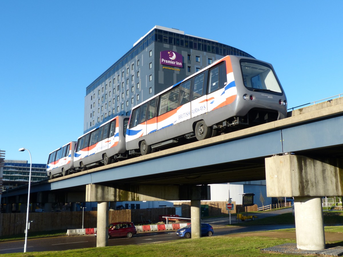 Ein Shuttle, das gerade vom Gatwick South Terminal kommt, erreicht nach nur 2 Minuten Fahrzeit in Kürze das North Terminal. 11.1.2014, Gatwick Airport