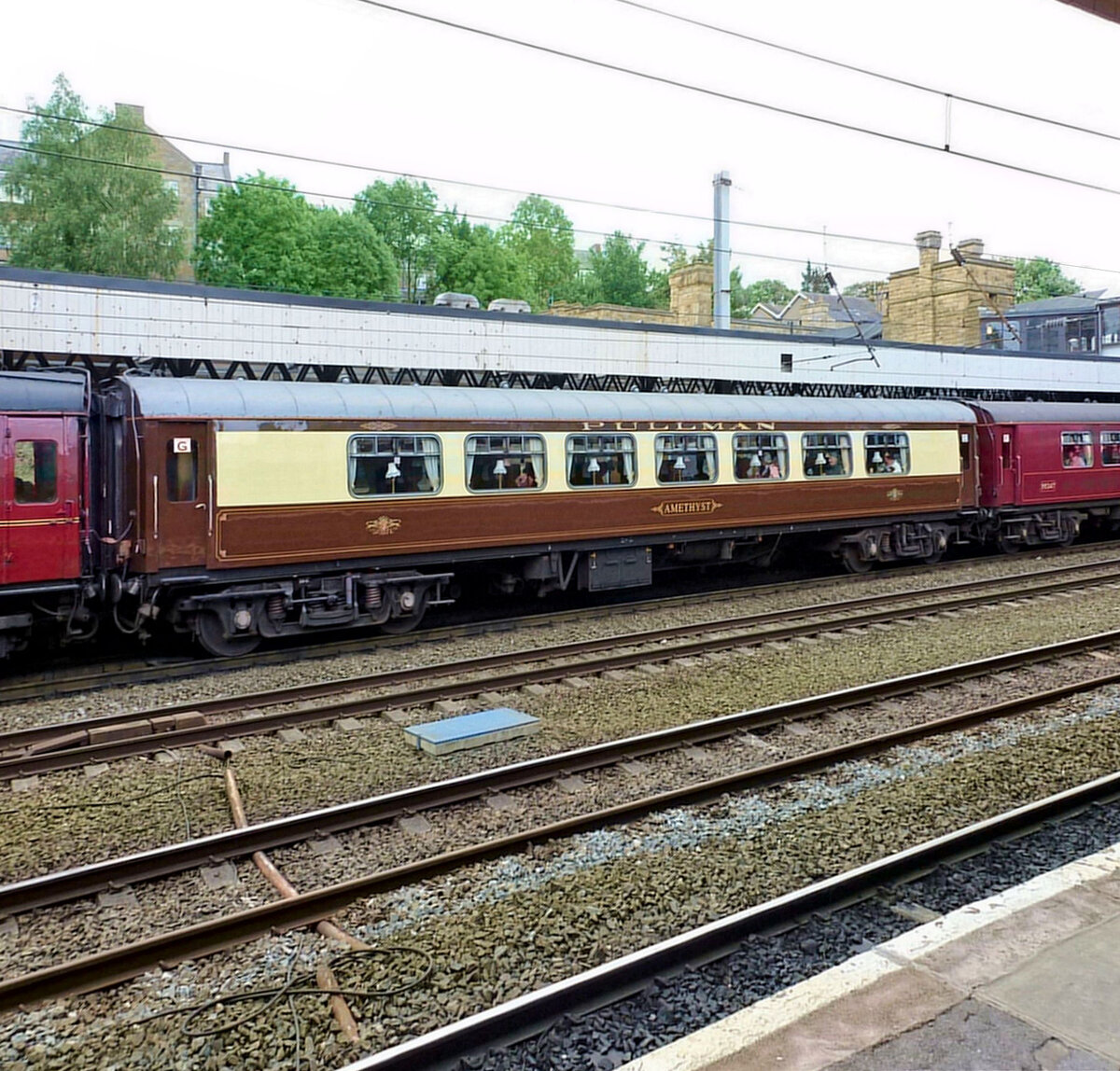 Britische Personenwagen - Pullman-Wagen: Die Firma Pullman betrieb 1874-1962 in Grossbritannien luxuriöse Wagen für höchsten Komfort und mit Bedienung. Nach 1962 wurde der Pullman-Service als Abteilung der Britischen Staatbahn weitergeführt, im Rahmen ihres Hotel- und Catering-Angebots. Die letzten eigentlichen Pullman-Wagen wurden 1966 gebaut. 1985 wurde ein Pullman-Service endgültig eingestellt (abgesehen von Sonderzügen). Im Bild ist Pullman-Wagen "Amethyst" von 1960 in einem Touristik-Dampfzug der West Coast Railways eingereiht, Lancaster, 11.Juli 2012 Peter Ackermann