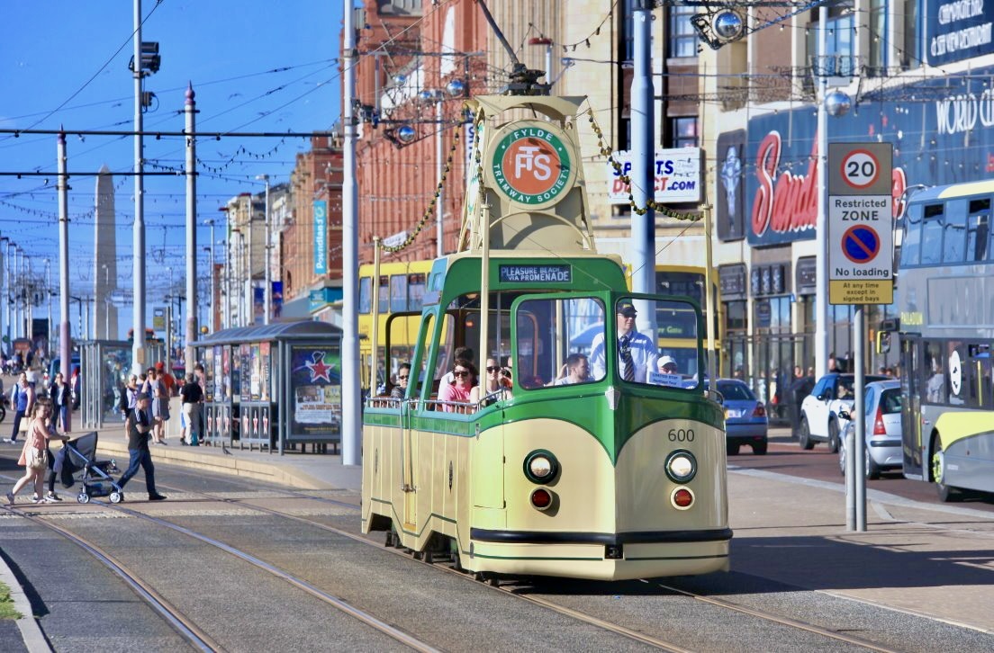 Die Blackpool Tram fährt mittlerweile im Regelverkehr nur noch mit Flexity-2-Zügen. Es sind immer zwei Zugbegleiter an Board, die Fahrkarten kontrollieren und verkaufen. Im Bereich der drei Piers fährt die Straßenbahn auffällig langsam, an manchen Stellen bremst sie auf 10 mph ab. 14.3.2015