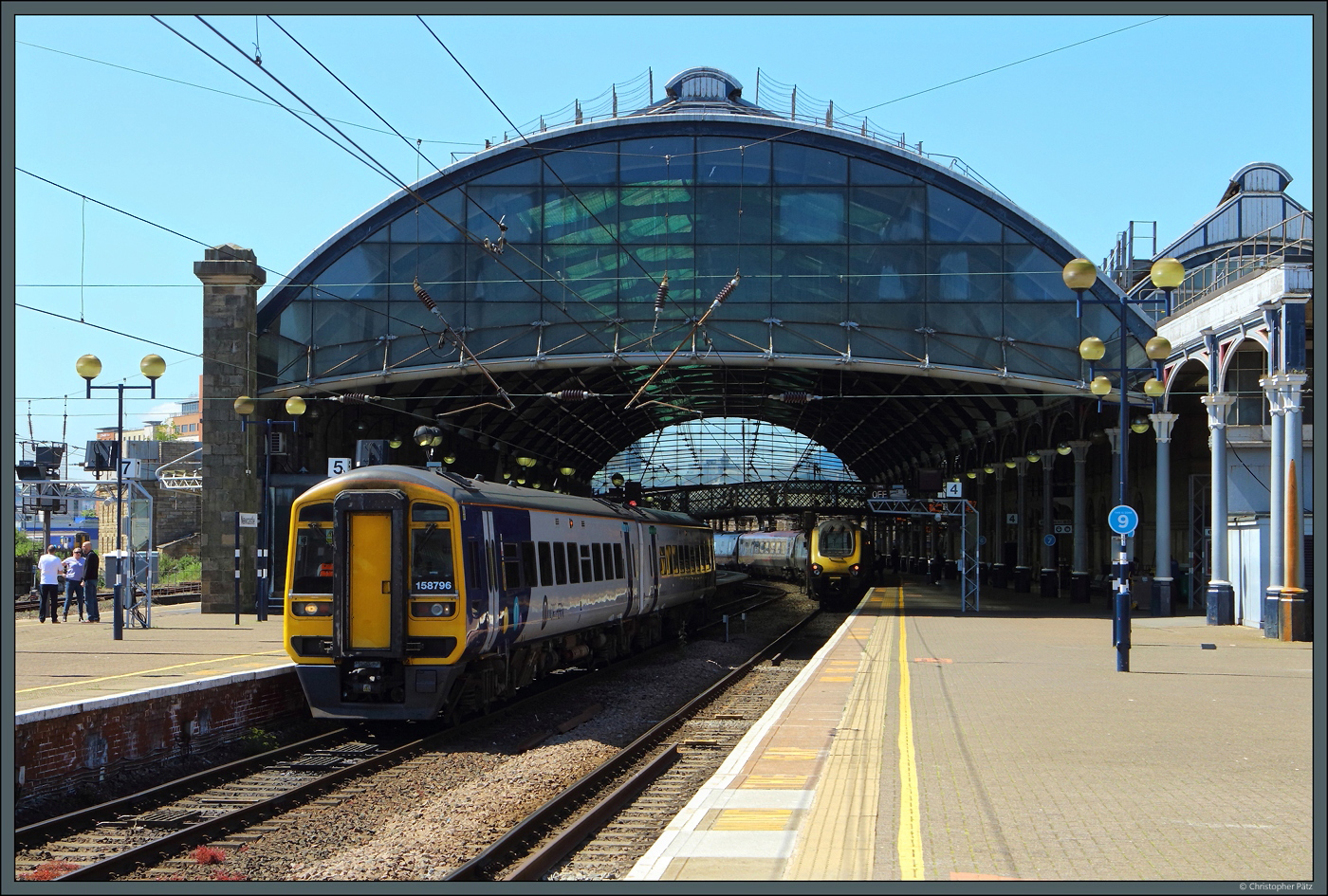 Am 12.07.2016 steht ein Dieseltriebzug der Klasse 158 von Northern im Bahnhof York zur Abfahrt bereit.