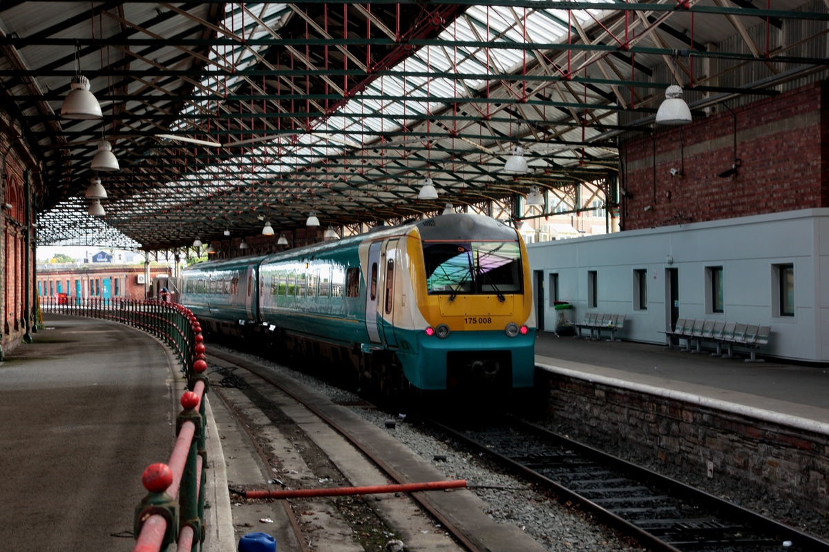Ein ATW Class 175 fährt am 16. August 2017 von Holyhead her kommend an Conwy Castle vorbei.