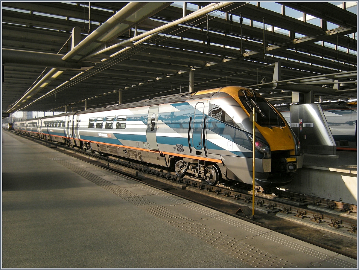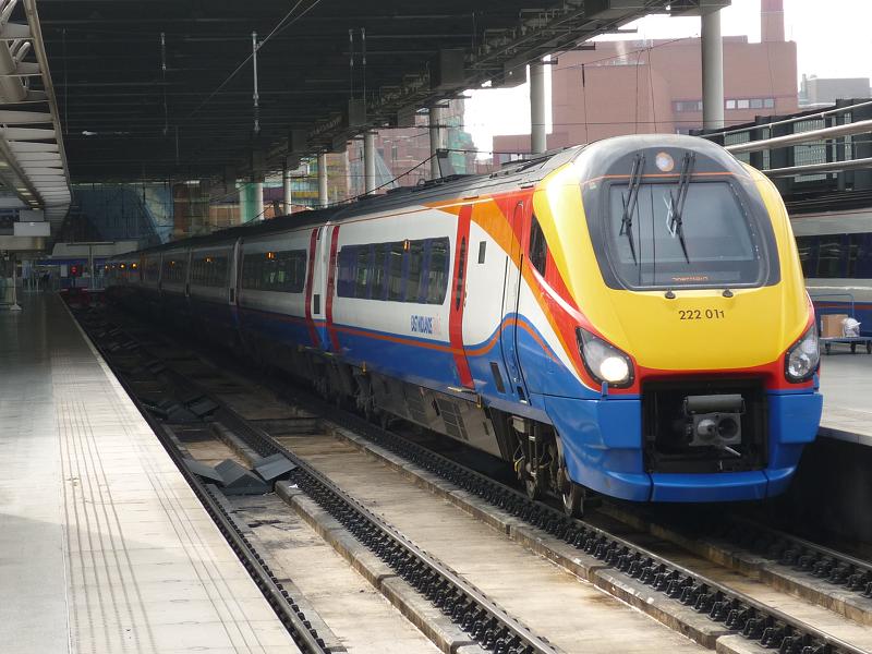 222 011 wartet in London St. Pancras auf Ausfahrt in Richtung Sheffield. Die Meridians (Class 222) ähneln den Voyager- und Super Voyager-Zügen (Class 220/221), haben aber eine andere Inneneinrichtung. Beachtenswert ist auch die letzte Stelle der Fahrzeugnummer. 2009-09-20.