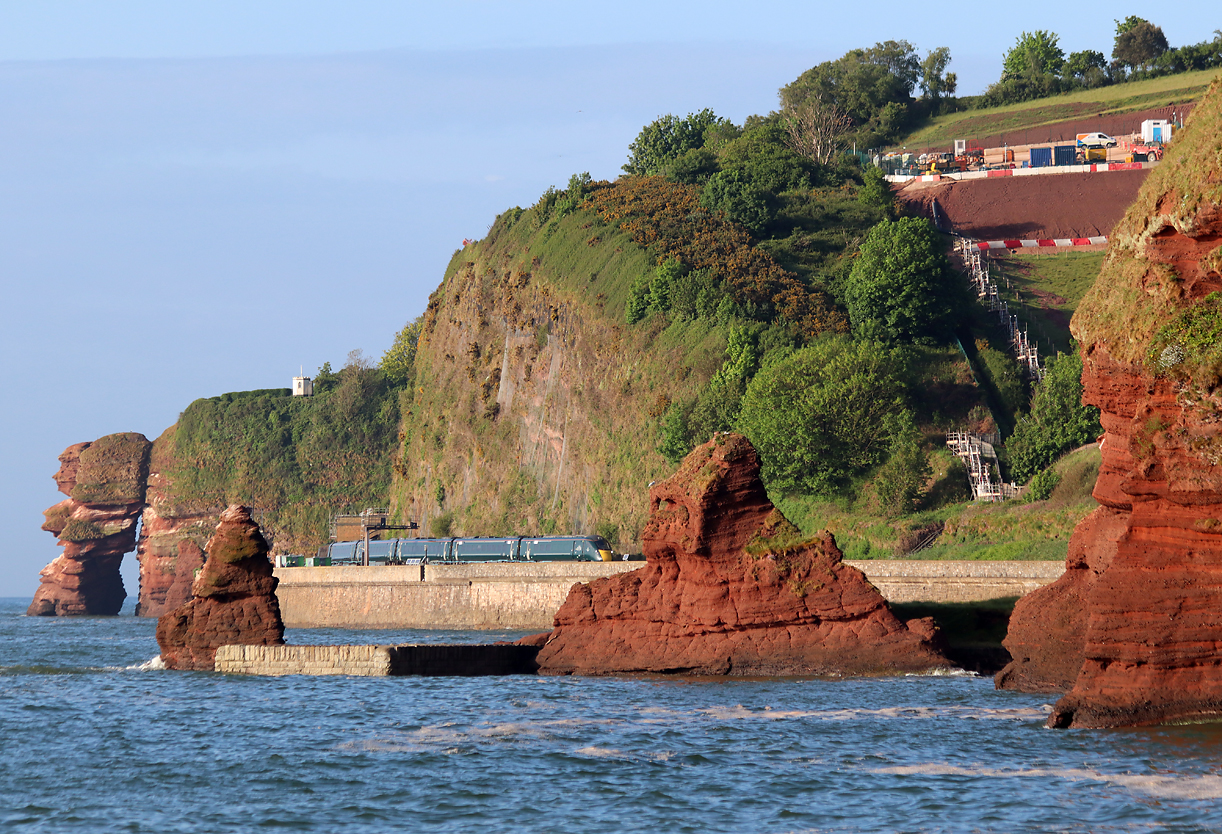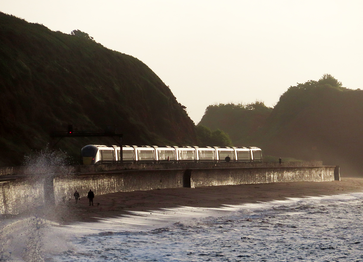Hochgeschwindigkeitszug der GWR befährt nächstens den Bahnhof Dawlish. Dawlish, 18.5.2022