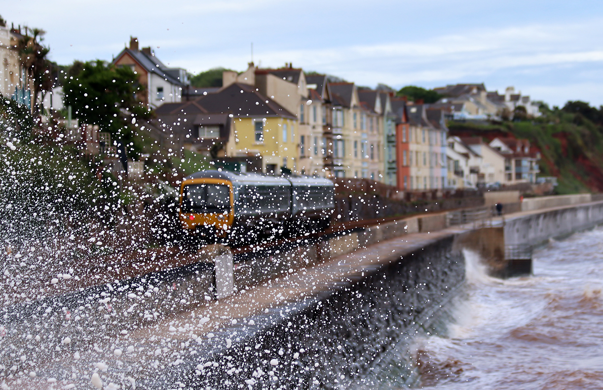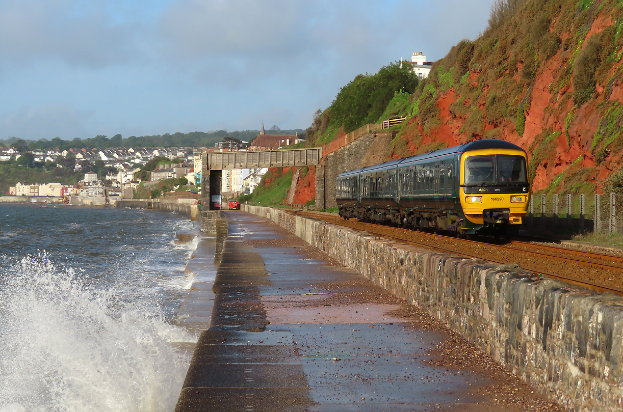 Regionalzug nach Exeter fährt in der Morgensonne vor einer schönen Häuserzeile bei Dawlish nordwärts. Dawlish, 18.5.2022