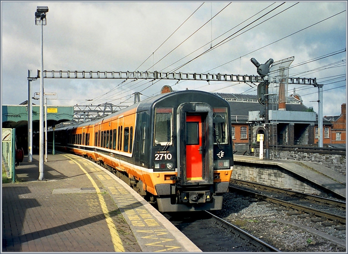 Der Irish Rail CIE Arrow Dieseltriebzug 2710 verlässt Dublin Connolly Station (Baile Átha Cliaht Stáisún Ui Chonghaile) in nördlicher Richtung. Analog Bild, Juni 2001