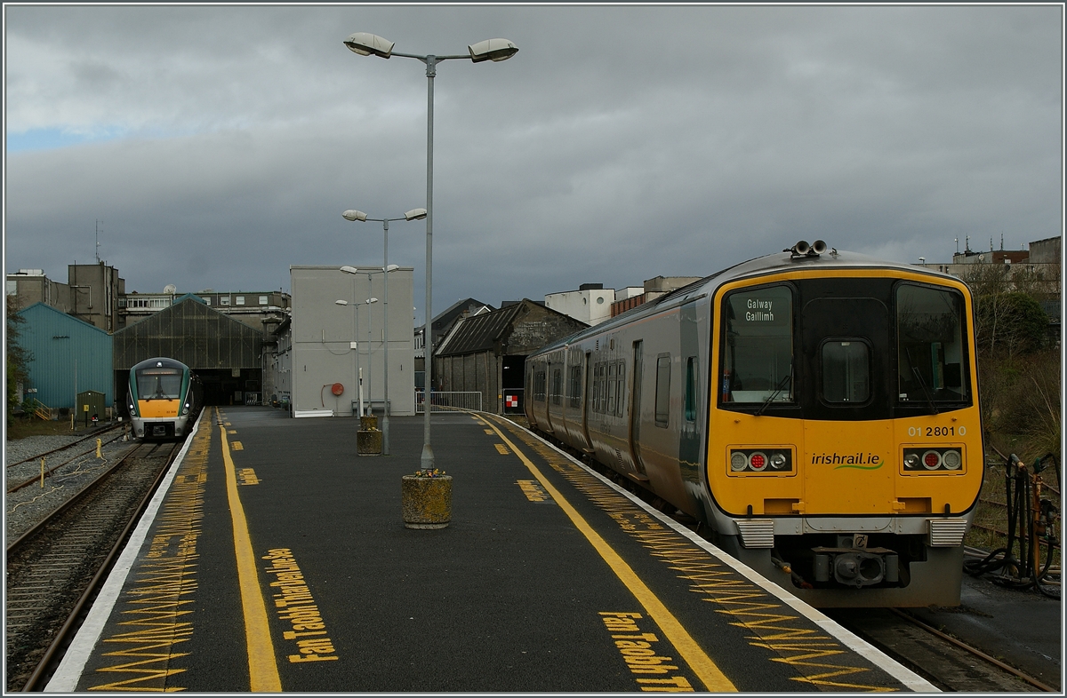Der CIE/IR Triebwagen 28-110 in Galway bedient die wiedereröffnete Strecke nach Limerick.