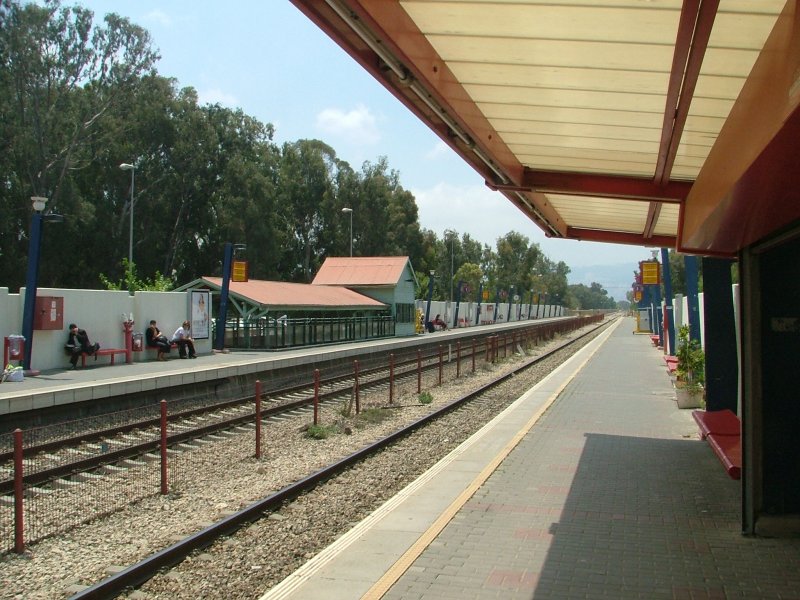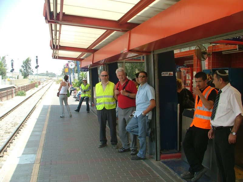 In Richtung Süden wird hier in Kiryat Motzkin der nächste Zug in Kürze erwartet. Das hier gerade ein kurzer, heftiger Regenschauer niederging ist allenfalls noch daran zu erkennen, dass die meisten Fahrgäste im Schutze der Bahnsteigüberdachung warten. Das könnte aber auch Sonnenschutz sein. (Israel, 14.05.2007)