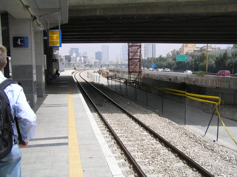 Sprung in den Norden von Tel Aviv, hier beginnt an der Station Tel Aviv University die Stadtstrecke. Mir gefällt die Station auch architektonisch, Details folgen. Gut zu erkennen auch hier die Mittellage der Bahnstrecke zwischen den Fahrbahnen des Highways. (T.A. 06.05.2007)