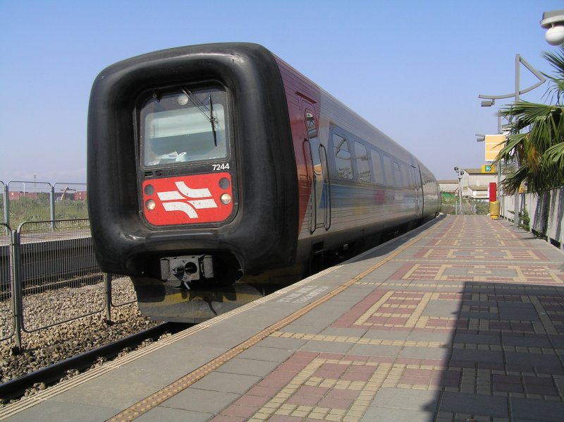 Eine Gumminase (IC 3) der Israel Railways verlässt am 12.08.10 Haifa in Richtung Naharyia. Im Hintergrund der 2002 eröffnete Haifa Sail Tower.