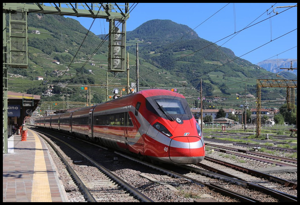 ETR 1000 Frecciarossa 400140-2 fährt hier in Bozen am 19.9.2025 um 13.19 Uhr nach Rom ab.