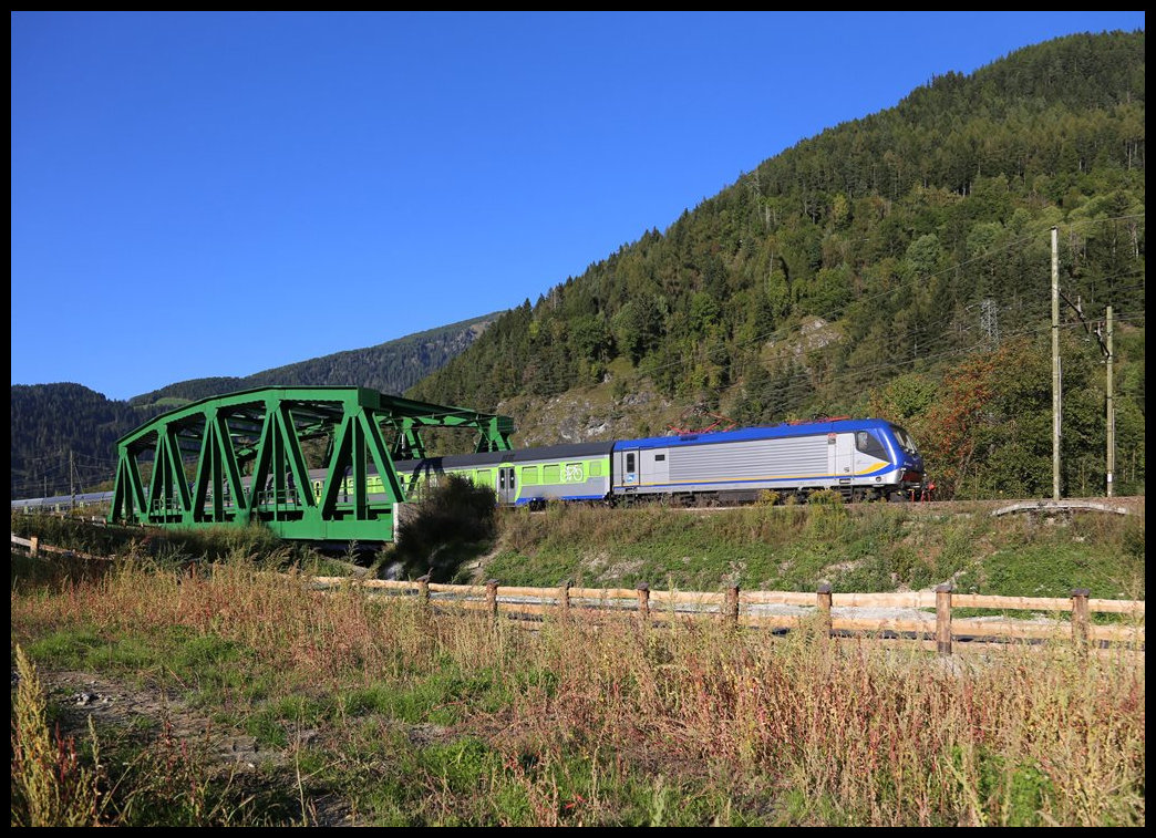 FS 464504-4 überquert hier am 19.9.2025 um 17.15 Uhr auf der Fahrt nach Bozen den Fiume Isarco bei Sterzing.