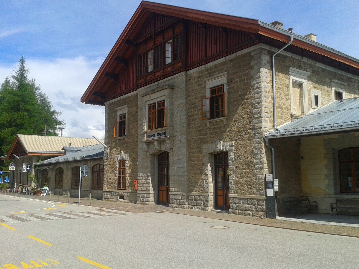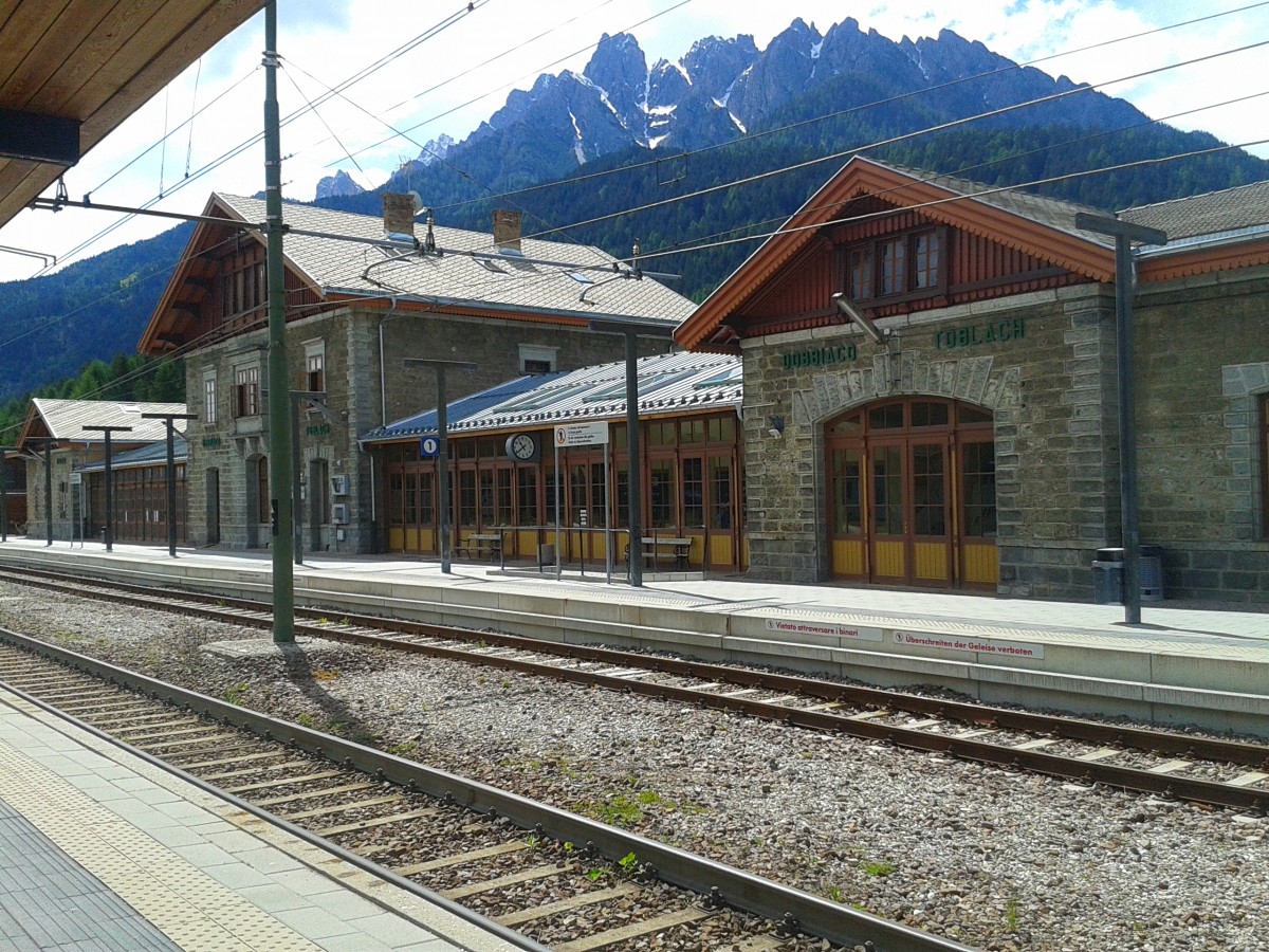 Bahnhofsschild von Dobbiaco/Toblach am 25.5.2015.