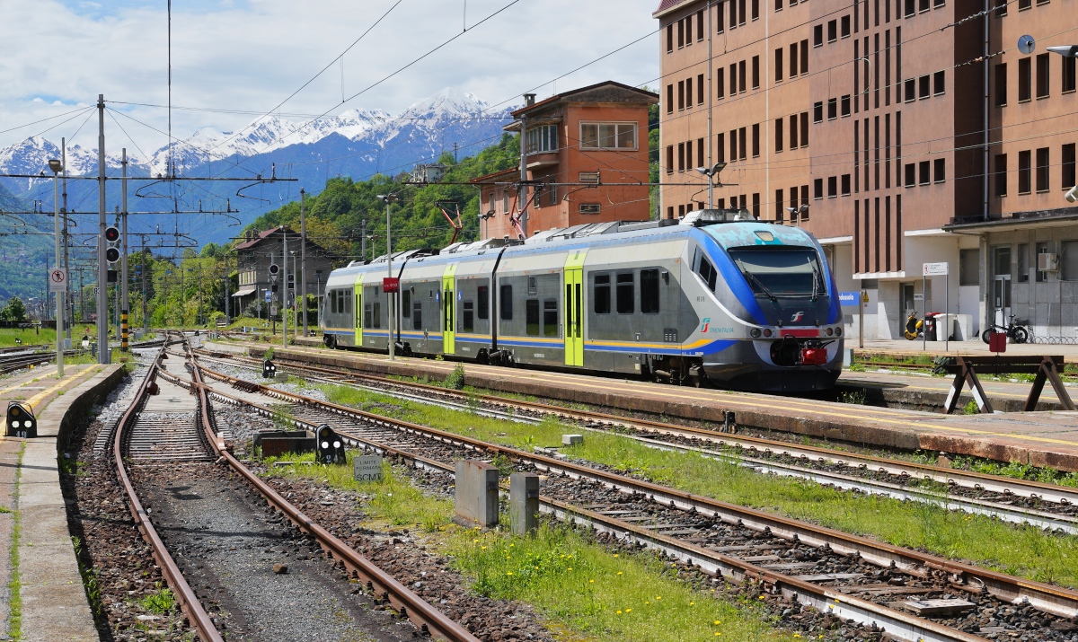 TILO Flirts RABe 524 gehören seit einigen Jahren auf Treniatlia- oder Trenordstrecken zum alltäglichen Betriebsgeschehen. Aber ein TILO Flirt im Piemont, genauer gesagt in Domodossola, ist dann doch eine Seltenheit. Der SBB TILO RABe 524 102 (UIC 94 85 0 524 012-7 CH-FFS) nun mit einem gehoben Stromabnehmer in den Gleichstromteil des Bahnhofs von Domodossola. Allem Anschein nach ist der Triebwagenzug auf Probefahrt.