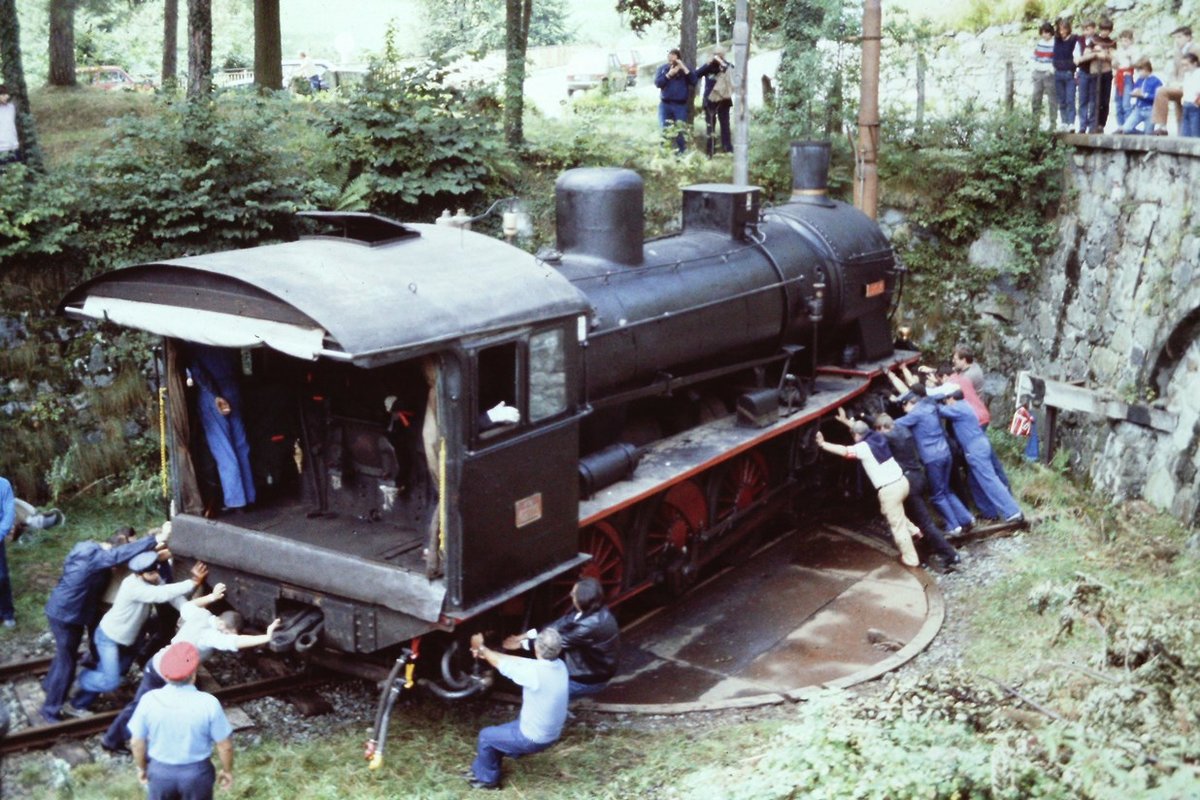 september 1983, scan from dia : steam locomotive 422.009 ( ex Prussian G8 ) during the manual turning on the turntable at Ceres ( Turin ), at the end of the line.