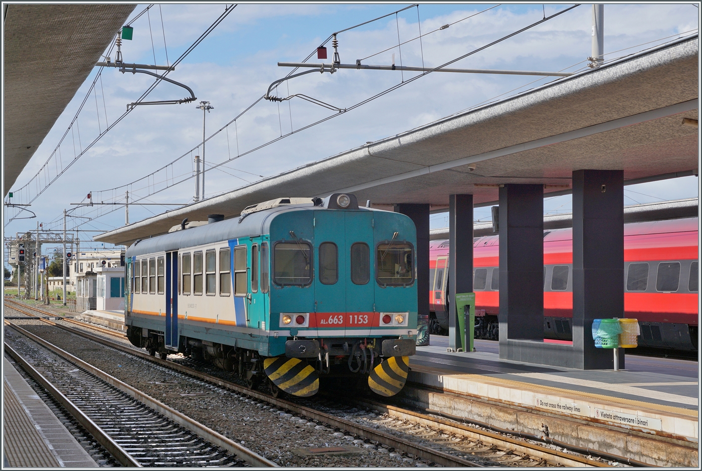 In Reggio di Calabria sah ich einen der wohl nun noch seltenen Dieseltriebwagen Aln 663 im Einsatz und dieser war erst noch in einem sehr erfreulich gutem Zustand. Da der Aln 663.1153 nach der Ankunft gleich auf ein Abstellgleis fuhr und ich zum Fotografieren den Bahnsteig wechselte, entging mir, von wo der Zug kam. Ich vermute es könnte der R 21597 von Roccella Jonica sein.
