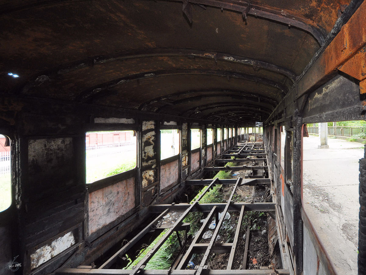 Überreste des OM-Saurer BXD-Sechszylindermotors im ausgebrannten Triebwagen SD80 (Fiat ALn 772) im Eisenbahnmuseum Warschau (August 2011)