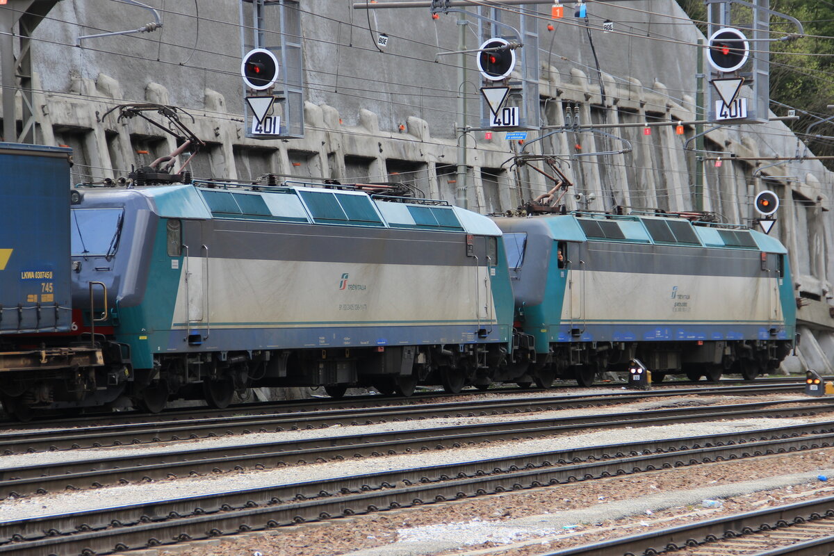 Trenitlia E405 006 & E405 003 kurz vor der Abfahrt mit einem KLV Zug Richtung Verona am Bahnhof Brenner/Brennero. Aufgenommen am 02.05.2014 Christoph Plank