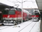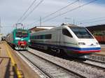 Eine wohl ziemlich fabrikneue E 464 mit einem Doppelstockpendelzug in Firenze SMN am 15. November 2007.